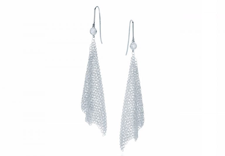 The form is malleable and ergonomic in the way it drapes over the body’s contours. Earrings in sterling silver with round brilliant diamonds. Size small, 2.75″ long. Carat total weight .14. Original designs copyrighted by Elsa Peretti.